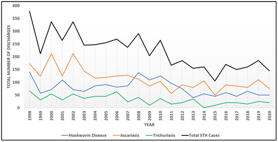 STH patient discharges as coded in the NIS database have shown a significant monotonic decline in the United States over the past two decades (Figure 1), which also aligns with reported decreasing global trends in these diseases [3]. Some authors have suggested that these reductions have occurred as a result of interventions targeting hygiene practices in water, sanitation, and hygiene (WASH), as well as targeted public health interventions like mass drug administration (MDA) [16,17,18]. In the U.S., the decrease in hospitalizations associated with STH infections could potentially be attributed to several aspects, including the wide-spread adoption of clean water systems, improved sanitation, and access to anthelmintic treatments, as suggested in a systematic review to assess long-term STH trends in the U.S. However, the authors admit that such speculation is unconfirmed, as there is very limited information about STHs in the U.S. presently [19].