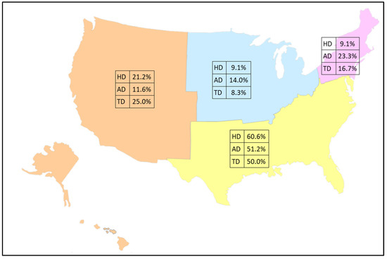 Percentage of discharge records by census region for 2018–2020 among 440 total cases of soil-transmitted helminths (hookworm disease: HD = 165, ascariasis disease: AD = 215, and trichuriasis disease: TD = 60). Base map layer purchased from https://www.editablemaps.com.