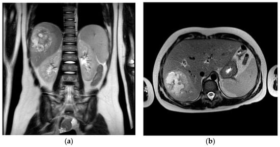 Subsequent MRI of the abdomen confirmed the T2-hyperintense and T1-hypointense lesion in the VII hepatic segment with dimensions of 65 × 53 × 74 mm (AP × LL × CC) (Figure 1).