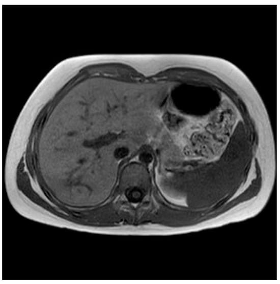 A T1-weighted follow-up MRI image after 6 months, revealing the complete resolution of the previous hepatic lesion.