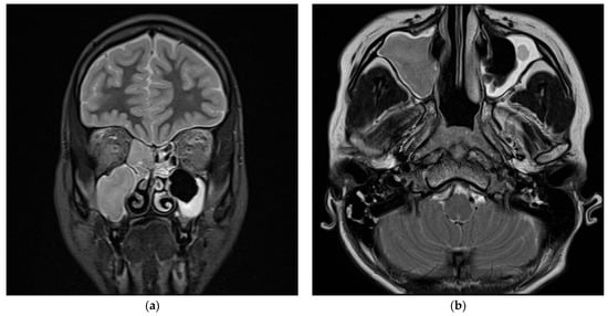 MRI T1-weighted hypointense image of sinusitis of the ethmoid and maxillary sinuses in the coronal plan (a). Concomitant hypointense signal in the mastoid regions is consistent with bilateral otomastoiditis (b).