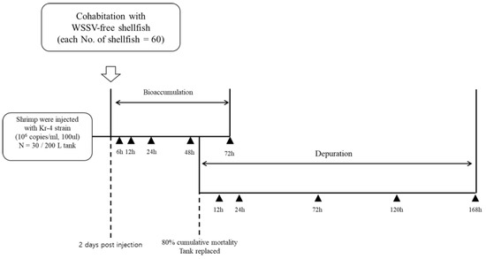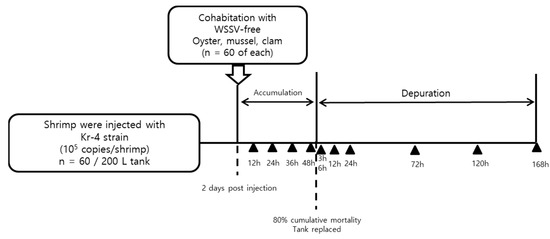 Schematic of the cohabitation of shellfish with WSSV-infected shrimp. Each of 60 shellfish were cohabitated with 60 WSSV-infected shrimp (105 copies/shrimp). Shellfish harboring WSSV particles were transferred to a new 100 L tank for depuration at 23 °C. Sampling times are denoted by black triangles.