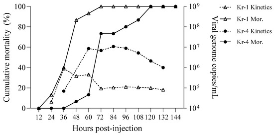 WSSV genome copy numbers in seawater from infected whiteleg shrimp with cumulative mortality (%). The titer of waterborne WSSV (broken line) and daily mortality (line) in tanks injected with the Kr-1 (△) and Kr-4 (●) strains are shown.