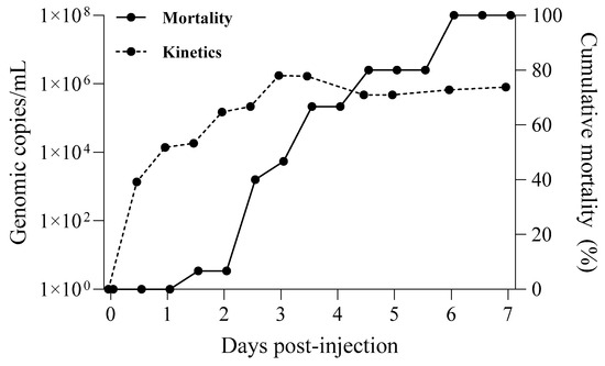 WSSV genome copy numbers in seawater from 30 infected whiteleg shrimp with cumulative mortality (%). The titer of waterborne WSSV (broken line) and daily cumulative mortality (line) in 100 L tanks injected with the Kr-4 strain are shown.
