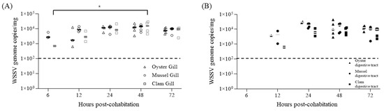 Individual WSSV genome copy numbers in gills (A) and digestive glands (B) during the low-dose bioaccumulation of oysters (triangle), mussels (circle), and clams (square). Five shellfish were sampled at each time point, and viral copy numbers were determined via qPCR using two-step PCR-positive samples. Horizontal lines indicate the median value, and broken lines indicate the detection limit for all graphs. An asterisk indicates a significant difference (two-way ANOVA, * p < 0.05).