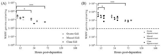 Individual WSSV copy numbers in gills (A) and digestive glands (B) during the depuration of oysters (triangle), mussels (circle), and clams (square). Five shellfish were sampled at each time point, and viral copy numbers were determined via qPCR using two-step PCR-positive samples. Horizontal lines indicate the median value, and broken lines indicate the detection limit for all graphs. An asterisk indicates significant difference (two-way ANOVA, * p < 0.05; *** p < 0.001).