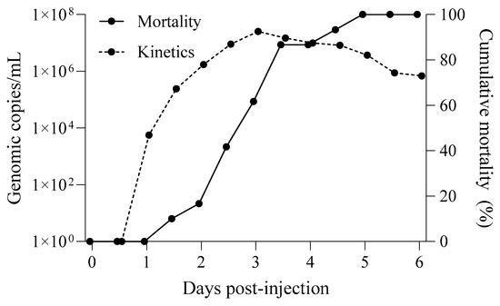 Cumulative mortality and WSSV kinetics in seawater were monitored (Figure 4). The infected shrimp (n = 30) had a cumulative mortality rate of 100% at 6 DPI. The concentration of WSSV genome copies released into the water peaked at 1.74 × 106 copies/mL at 3 DPI, when shrimp mortality was 46.7%, and gradually decreased thereafter.