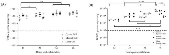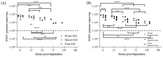 Individual WSSV copy numbers in gills (A) and digestive glands (B) during the depuration of oysters (triangle), mussels (circle), and clams (square). Five shellfish were sampled at each time point, and viral copy numbers were determined via qPCR using two-step PCR-positive samples. Horizontal lines indicate the median value, and broken lines indicate the detection limit for all graphs. An asterisk indicates significant difference (two-way ANOVA, * p < 0.05; ** p < 0.01; *** p < 0.001; **** p < 0.0001).