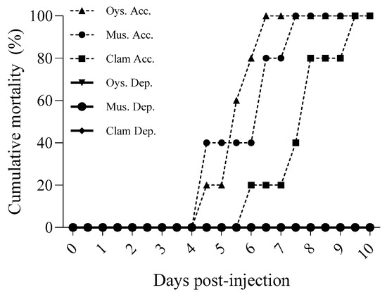Cumulative mortality (%) of whiteleg shrimp challenged with shellfish-derived WSSV. Digestive gland homogenates from WSSV-accumulated shellfish (2 days of cohabitation with WSSV-infected shrimp) and depurated shellfish (168 h of depuration after accumulation) were intraperitoneally injected (10 mg per shrimp) into five whiteleg shrimp. Symbols represent different shellfish species: oyster (▲), mussel (●), and clam (■). The dashed lines indicate accumulated (Acc.) samples, and the solid lines represent depurated (Dep.) samples.