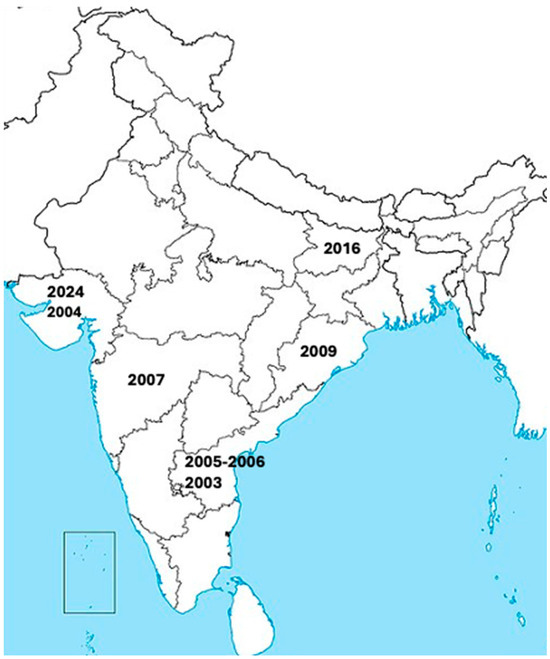 CHPV was first discovered in 1965 during an outbreak in the Chandipura village of the Nagpur district in Maharashtra state, India, and hence it was named the Chandipura virus [2]. CHPV was initially isolated from two cases in adult humans presenting with fever and joint pain [2]. CHPV has since caused several large outbreaks throughout India, as shown in Figure 1. Rao and colleagues identified CHPV as the causative infectious agent of a large encephalitis outbreak in Andhra Pradesh, India, from June to September 2003 that led to a very high rate of fatality (~55%) [3]. A total of 7 CHPV outbreaks have occurred since 2003 (including the 2024 outbreak), which tended to peak with the monsoon season and had case fatality rates between 28 and 79 percent [1,3,9,10,11,12,13,14] (Table 1). CHPV has also been suspected as an etiological pathogen in historical outbreaks of high mortality that occurred prior to the availability of genetic sequencing, which were previously attributed to other endemic infectious diseases such as dengue, chikungunya, measles, and Japanese encephalitis virus [9,15,16,17]. CHPV likely causes low levels of human cases in between outbreaks, with one study detecting CHPV RNA in 3/278 cases of acute encephalitis syndrome (AES) in India from 2018 to 2020 [18].