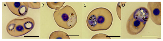 Light photomicrographs of novel Haemocystidium sp. genotype A, isolated from Australian sea turtles. (A) Immature gamonts of Haemocystidium sp., with a large vacuole and granules in the outer rim of the parasite from Chelonia mydas. (B) Oblong light pink microgamont of Haemocystidium sp., with granules scattered and clumped together within the parasite from C. mydas. (C) Small round dark blue macrogamont of Haemocystidium sp., with a purple nuclear region, single vacuole and scattered granules within the parasite from C. mydas. (D) Large round dark blue macrogamont of Haemocystidium sp., with vacuoles and scattered granules within the parasite from C. mydas. Scale bar represents 10 μm.