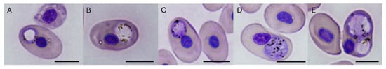 Mature gamonts of novel Haemocystidium sp. genotypes A and B represent typical morphological characteristics of male and female stages, and, like the immature forms, were polymorphic in nature, with different sized gamonts detected, representing small and large forms. The microgamonts are circular to oblong, contain a light pink cytoplasm with zero to two vacuoles and contain numerous black to brown pigment granules scattered or grouped into small clusters (Figure 2B and Figure 3B). The macrogamonts contain nuclear regions, are circular to oblong, have a bluish to purple cytoplasm with zero to nine vacuoles and contain numerous black to brown pigment granules scattered or grouped into small clusters (Figure 2C,D and Figure 3C,D). Two gamonts within a single erythrocyte was found to be more common for novel Haemocystidium sp. genotype A (Figure 2A) when compared with erythrocytes infected with novel Haemocystidium sp. genotype B, with only a few exceptions (Figure 3E).