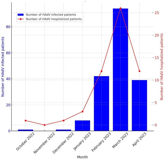Month-by-month distribution of human-adenovirus-positive infections. Blue bar: number of HAdV-infected patients. Red line: number of HAdV-hospitalized patients.