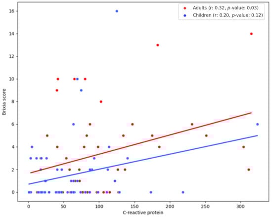 Correlation between Brixia score and C-reactive protein (mg/L) in children and adults.