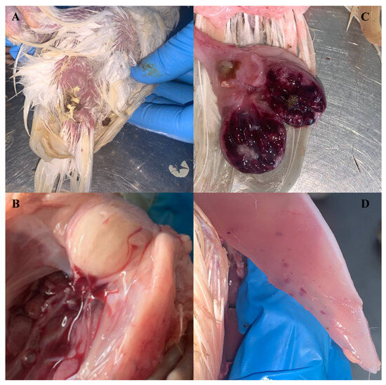 Gross necropsy lesions in layer chicks. (A) Vent soiled with white viscous to greenish fecal material (pasty vent), (B) markedly enlarged unopened bursa of Fabricius, (C) opened bursa of Fabricius which is hemorrhagic with necrotic foci and catarrhal exudate on the serosal surface, and (D) petechial to ecchymotic hemorrhage on the breast muscle.