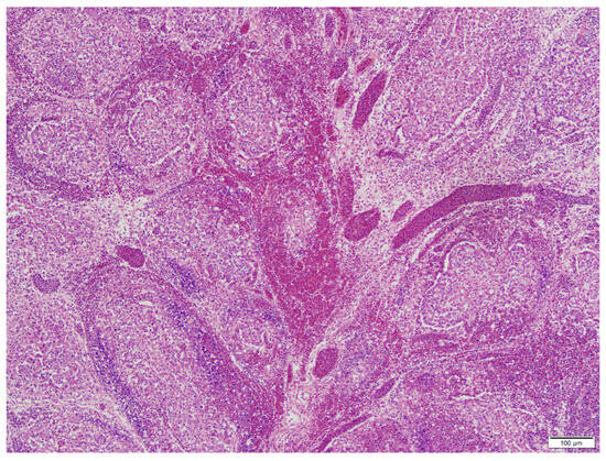 Kidneys were severely congested with occasional small clusters of proximal tubular cells characterized by highly eosinophilic cytoplasm and karyorrhectic nuclei. Within the white pulp of the spleen, there was severe necrosis characterized by karyorrhectic and pyknotic nuclei and poor differentiation of cells. Within the red pulp, there was extensive vacuolar change with abundant macrophages and heterophils, indicating acute necrosis, characterized by indistinct cytoplasmic borders and karyorrhectic nuclei.
