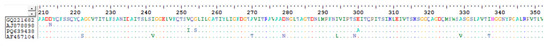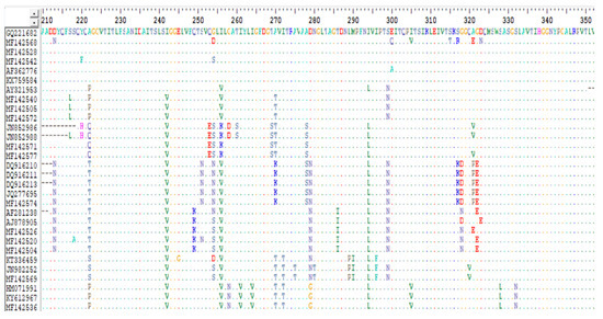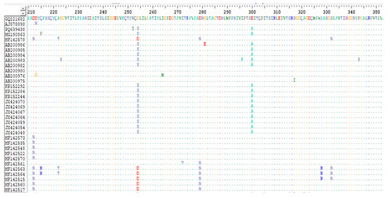 Continuation of BioEdit analysis of deduced amino acid sequences of hvVP2 gene (210–350 aa) with rA andUK661 strains as reference strains.