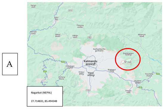 Figure 1. Locations of the study sites in Nagarkot (Nepal; (A)) and Istanbul (Türkiye; (B)).