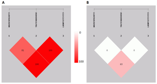 Figure 3. Linkage disequilibrium test of the three (M815I (ATG > ATT), T917I (ACA > ATA), and L920F (CTT > TTT)) mutation sites of the lice samples from Türkiye (A) and Nepal (B). The color bar indicates the power of the LD analysis results.