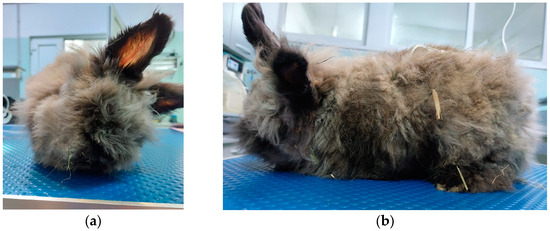 During the course of 13 days of hospitalization, the rabbit’s general state initially improved by the presence of fecal output, moderate appetite, and a better general state, but it continued to present a head tilt to the left (Figure 1) and ataxia, together with newly observed symptoms like polydypsia and polyuria. Based on clinical manifestation, the main two differential diagnoses included encephalitozoonosis and otitis media/interna. The patient’s state was stagnant, with the symptoms described before for approximately 10 days of hospitalization. Unfortunately, from Day 11, the rabbit’s neurological symptoms worsened, with a more severe head tilt to the left and hypersensitivity to handling, followed by the appearance of seizures with rolling and urinary incontinence. Euthanasia was recommended to the owner and was performed after 13 days of hospitalization.