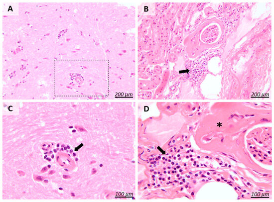 Histopathological images of the cerebrum (Images (A,C)) and kidneys (Images (B,D)). Cerebrum: multifocally, the perivascular Virchow–Robin spaces are distended and infiltrated by a moderate number of lymphocytes and plasma cells (Image (C), black arrow). Kidneys: the renal corpuscle capsule is markedly thickened by fibrous connective tissue (Image (D), asterisk), and multifocally, the renal interstitium is infiltrated by a moderate number of lymphocytes and plasma cells (Image (D), black arrow). H&E stain.