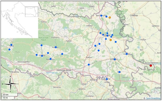 Map of the studied area of three counties in eastern Croatia. Orange dots are positive sites for Flavivirus, red dots are positive sites for WNV, and blue dots are negative sites.