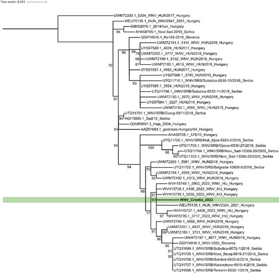 Maximum likelihood phylogenetic tree of the Croatian WNV isolate (GenBank database Acc.No.: PQ468649) and WNV isolates from neighboring countries. The tree was constructed based on the amino acid sequences of the complete polyprotein region of the viruses. All sequences belong to the Lineage 2 genetic variant. Sequences are indicated by their GenBank accession number, strain name, and country of origin. The sequence related to this study is highlighted with a light green background. The scale bar indicates the mean number of amino acid substitutions per site. The tree was created according to the best-fit model HIBb + F + I with a bootstrap resampling method with 1000 replicates.