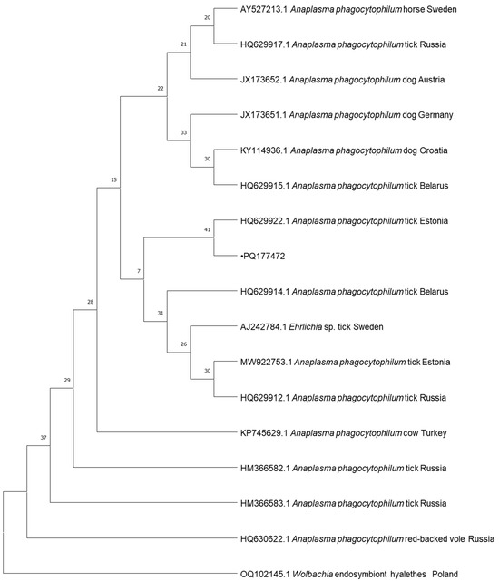 The sequence of the Anaplasma-positive sample from our study (PQ177472) was identified as uncultured Anaplasma sp. and was identical to those obtained from I. ricinus from Estonia (HQ629922), sheep in Norway (CP015376) and dogs in Japan, Croatia, Austria, Germany, and Poland (LC334014, KY114936, JX173651, JX173652, DQ105667).
