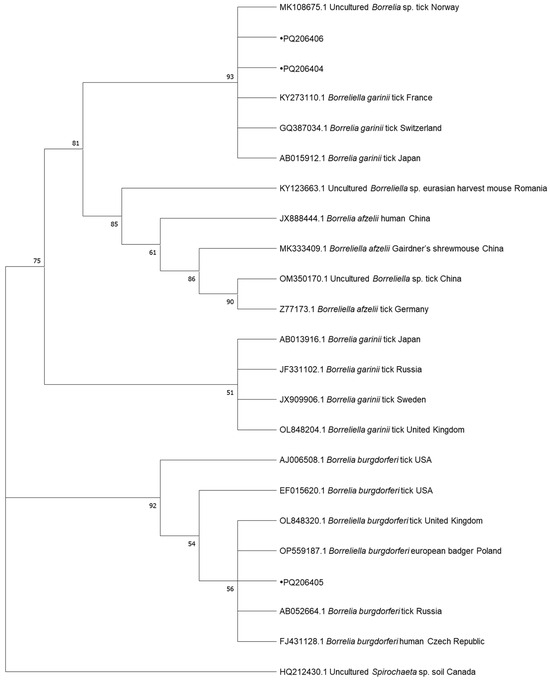 Sequencing of Borrelia-positive samples revealed the presence of two genospecies. Two of our samples were identified as B. garinii. One (PQ206404) was identical and the other one (PQ206406) showed 99.58% similarity to the isolates recovered from I. ricinus in France and Germany (KY273110, MW489079). The third sample (PQ206405) was identical to B. burgdorferi detected in a Eurasian badger from Poland (OP559187) and I. ricinus from the Czech Republic and Great Britain (AF497979, OL848352).