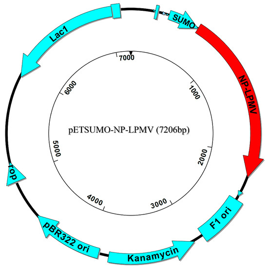 Map and features of pET SUMO-NP-LPMV vector construction. The red arrow indicates the cloned NP gene.