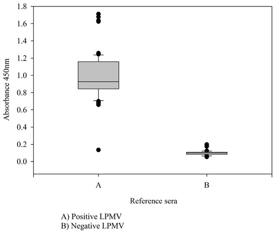 Distribution of OD450 mn of positive and negative reference sera in the rNP-LPMV iELISA test represented by box-and-whisker plot.