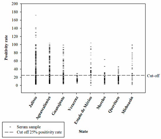 Distribution of the positivity rate of the serum samples from the eight states of Mexico used in the present study. The dotted line indicates the cut-off point of the test.