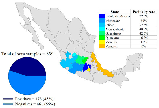 Of the 839 serum samples collected from eight states in Mexico (Table S1), 45% (378) were positive. The state of Mexico had the highest positivity rate with 72.5% (37/51), followed by Michoacán with 60% (21/35), Jalisco with 57.5% (146/254), Aguascalientes with 48.9% (89/182), Guanajuato with 42.6% (46/108), Querétaro with 16.3% (14/86), Morelos with 11% (8/73), and, lastly, Veracruz with 6% (3/50) (Figure 5).