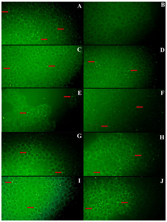 Indirect immunofluorescence in SCP cell culture observed at 20×. (A) Positive hyperimmune control serum. (B) Negative reference serum. (C) Positive sample from the State of Mexico. (D) Positive serum from Michoacán. (E) Positive serum from Jalisco. (F) Positive serum from Aguascalientes. (G) Positive serum from Guanajuato. (H) Positive serum from Querétaro. (I) Positive serum from Morelos. (J) Positive serum from Veracruz. Red arrows indicate some specific fluorescent foci.