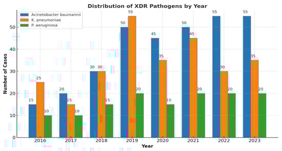 Most cases occurred in Intensive Care Units (ICUs) (74.3%), followed by medical wards (64%) and surgical wards (22%) (Table 2). The yearly distribution of XDR isolates is presented in Figure 1. Notably, our data indicate a statistically significant increase in the prevalence of XDR Acinetobacter baumannii after 2019 (15% in 2016 vs. 50% in 2019, p: 0.017), while the prevalence of XDR K. pneumoniae decreased during the same period (55% in 2019 vs. 30% in 2022, p: 0035), except for a peak in 2021.