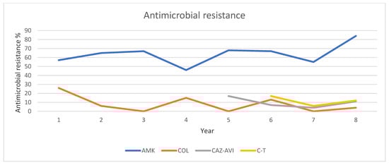 Trends of antibiotic resistance of CR P. aeruginosa isolated in BSIs during 2016–2023.Abbreviations: AMK: amikacin, COL: colistin, CAZ-AVI: ceftazidime-avibactam, C-T: ceftolozane-tazobactam.