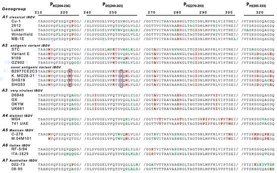 Amino acid substitutions at putative antigenic sites on VP2 projection domains of IBDV. Four P domains, PBC, PDE, PFG, and PHI, possessing the putative antigenic sites of VP2, are indicated on the top with the amino acid number. Deduced amino acid sequences in the projection domains of IBDV B2977CE2C3 are compared with those of other strains in different genogroups (A1, A2, A3, A4, A5, A6, and A7). Relevant sequences of IBDV strains were collected from GenBank. A common amino acid found in a genogroup is shown in red. An exceptional amino acid that is not found in other strains within a genogroup is shown in green. Two amino acids (221K and 252I) commonly found in the sub-genogroup A2d strain are shown in the box.