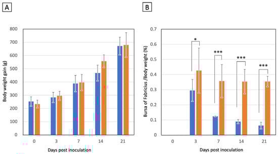 Effects of the infection of novel antigenic IBDV B2977CE2C3 strain on BW and BF. The increase in body weight (A) and the body weight/BF weight ratio (B) were examined in IBDV B2977CE2C3 infected (blue) and mock-infected chicken (orange) groups. All chickens in both groups were weighed before inoculation (day 0). Six chickens of each group were weighed at 3, 7, 14, and 21 days post-inoculation (pi) and were then sacrificed. The BF was isolated from the sacrificed chickens, and its mass was weighed. The mean value at each measurement point is shown with a bar graph. Symbols * and *** indicate p < 0.05 and p < 0.001, respectively, calculated using an unpaired t-test between the B2977CE2C3 strain-infected and mock-infected groups. Deviation (+/− SD) is shown with error bars on the bar graph.