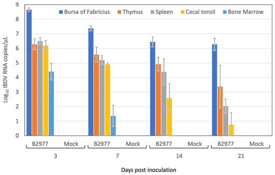 Tissue samples, such as cecal tonsil, thymus, spleen, BF, and bone marrow, were temporarily stored at −80 °C for subsequent IBDV RNA isolation. The frozen tissue samples were thawed immediately before homogenization. Samples were weighed, and nine volumes (convert 1 g to 1 mL) of the phosphate-buffered saline containing penicillin and streptomycin (1000 μg/mL each) were added. Samples were homogenized in a tissue blender and followed by centrifugation (9800× g for 10 min). Supernatants were designated as 10% (w/v) tissue homogenates. Viral RNA (60 μL) was extracted from 140 μL of the 10% (w/v) tissue homogenates using the QIAamp Viral RNA Mini kit (Qiagen K.K., Tokyo, Japan) according to the procedure indicated by the manufacturer.