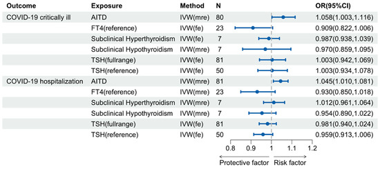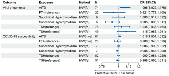 To enhance the accuracy of our MR analysis, we employed linkage disequilibrium pruning to eliminate variants that were highly correlated (R2 < 0.001) within a 10 Mb window) with the presumed genetic instruments. We also excluded SNPs with a minor allele frequency <0.01, as they may elevate the risk of type I error and skew the results towards the null. Building upon the findings from Teumer et al.’s GWAS on thyroid function, we identified 61, 31, 8, and 8 independent Single Nucleotide Polymorphisms (SNP) associated with normal-range TSH and FT4 levels, subclinical hypothyroidism, and subclinical hyperthyroidism, respectively [35]. A more recent GWAS meta-analysis unveiled 99 independent top variants across 74 loci, explaining 13.3% of the variance in full-range TSH levels [36]. In the case of AITD, Saevarsdottir et al. reported 99 genome-wide significant associations at 93 independent loci [32]. Nonetheless, several IVs were excluded: (1) TSH within reference range: SNP rs200574439, falling under the category of Insertion and Deletion (InDel), was excluded in this study. The variants Rs8176645 (mapped to ABO) and rs1157994 (mapped to BCAS3) were excluded due to their pleiotropic effects and lack of specificity to thyroid tissue [37]. Additionally, rs12390237 was omitted because it mapped to the X-chromosome, creating disparities as women possess two X-chromosomes, while men have only one X-chromosome [37]; (2) Subclinical Hyperthyroidism: The SNP rs925488 mapped to FOXE1 was discarded because its effect allele was associated with both hypo- and hyperthyroidism simultaneously [37]. Furthermore, several SNPs significantly linked (p < 5 × 10−8) to potential confounders of the association between thyroid function and viral pneumonia, COVID-19 susceptibility, COVID-19 hospitalization, and COVID-19 critical illness, such as body mass index, smoking, drinking, physical activity, education level, and other respiratory diseases. In order to prevent any potential influence from horizontal pleiotropy, we performed a search using PhenoScanner V2 and excluded these specific SNPs from our analysis [38].