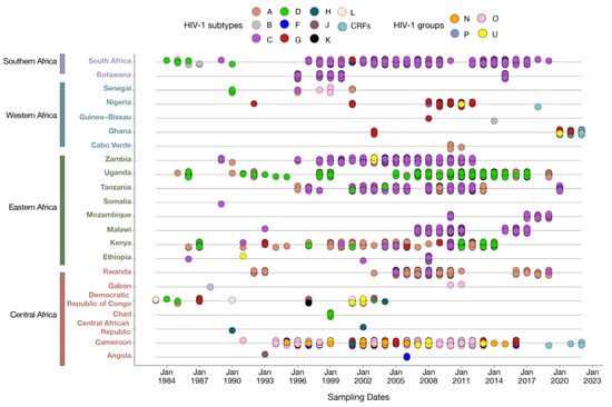 Temporal sampling of HIV integrase sequences in different African regions (1983–2022). Sampling of all available HIV IN sequences in different African countries through time, annotated according to their subtype assignment. Each dot represents an individual sample, with overlapping subtypes indicating isolation within the same time frame.