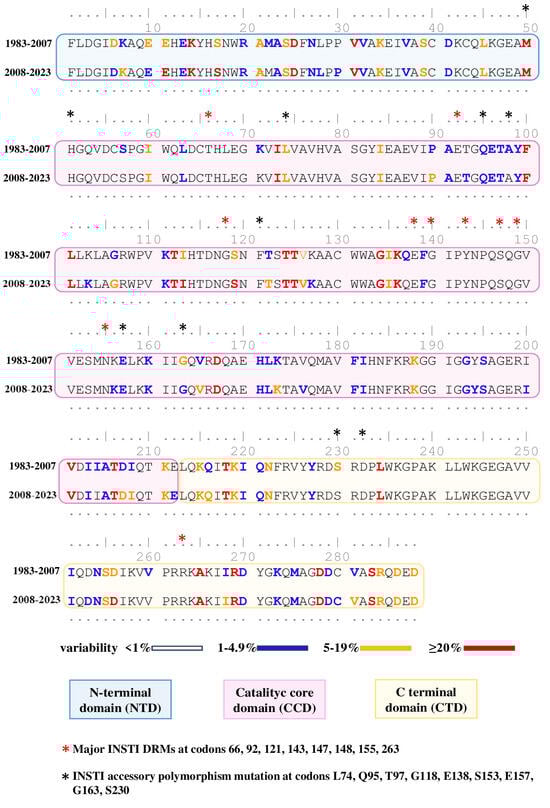 Concerning highly conserved amino acid positions (with <1% variability), sequences between 1983 and 2007 and 2008 and 2023 showed similar levels of variability, accounting for 65.62% (189/288) and 64.63% (187/288), respectively. Among the 288 IN amino acids, there was no significant difference in variability concerning major or accessory INSTI DRMs, except for position G163, which was less conserved in samples from 2008–2023.