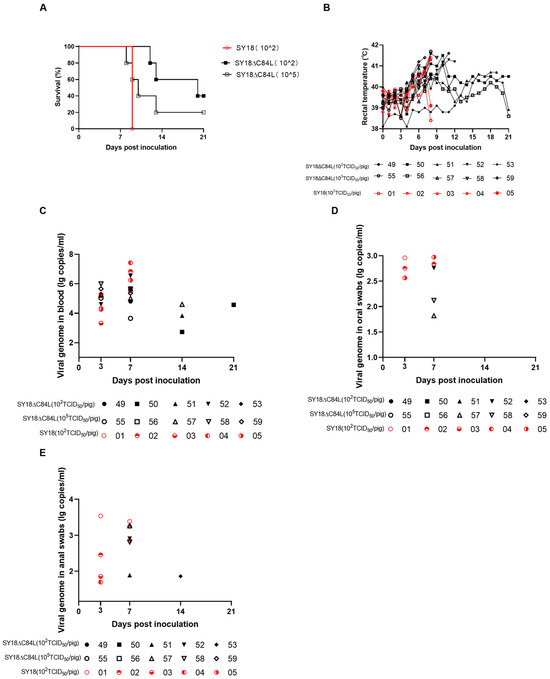 Virulence evaluation of SY18ΔC84L and SY18 in pigs. (A) Survival and body temperature (B) in pigs challenged with SY18ΔC84L and wild-type virus SY18. The genomic content of ASFV in the blood (C), oral swabs (D), and anal swabs (E) was detected in pigs after inoculation with SY18ΔC84L and SY18 at different doses.