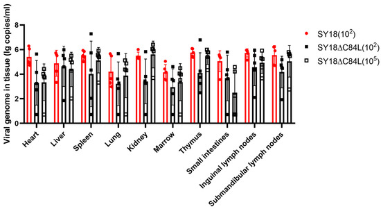 In order to detect the distribution of the ASFV in the tissues of pigs after infection, qPCR was used to detect the viral genome content. The samples were collected from the heart, liver, spleen, lungs, kidneys, and submandibular lymphoid tissues of three groups of pigs previously described. The time of sample collection is consistent with the time described in the survival curve (Figure 3A), and the tissues of pigs that lived to 21 days were collected after euthanasia. The results showed that high viral genome content was detected in all tissues, whether they were inoculated with SY18 or SY18ΔC84L (Figure 4).