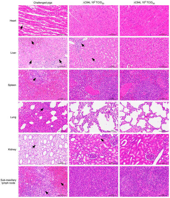 Characterization of histopathological lesions of different organs from indicated pigs challenged with ASFV SY18. The piglets were challenged with SY18 and different dose of SY18ΔC84L. The different tissue samples were collected as indicated to analyze the comparative histopathological lesions. The images show comparative histopathological lesions in different tissue samples. Arrows indicate pathological changes in relevant tissues.