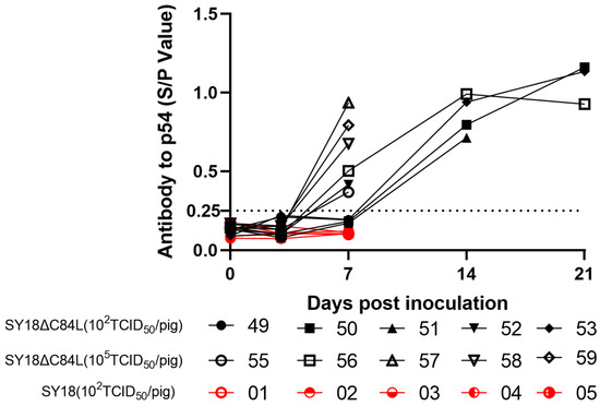 In this study, the antibodies of pigs infected with an immunodeficiency virus were detected on the seventh day. Some pigs infected with the immunodeficiency virus produced antibodies but eventually developed the disease and did not survive. This research result is similar to previous research reports. There is no direct correlation between the antibodies produced by animals infected with attenuated viruses and the immunity of the virus and the host. In other words, the specific mechanism has yet to be elucidated [40]. ASFV infection can also induce host cellular immune responses according to reports. However, the cellular immunity triggered by the attenuated strain is more obvious, and pigs infected with the virulent strain die before producing significant cellular immunity. Previous studies have shown that the proliferation of CD8α-T cells was only detected on the tenth day after ASFV infection in pigs [41]. In this study, pigs immunized with SY18 C84L began to die on the eighth day. However, the expression of C84L protein can induce an increase in TNF-a levels in PAM cells, indicating that C84L protein is also associated with cellular immunity according to recent C84L functional studies [29].