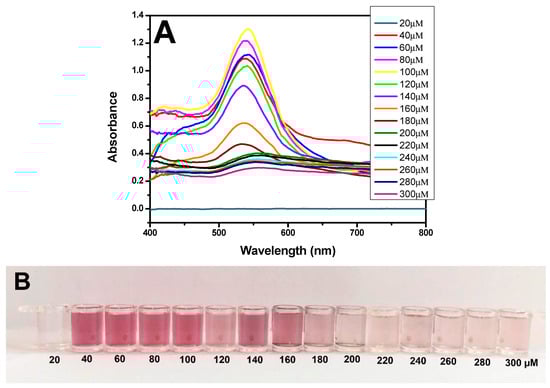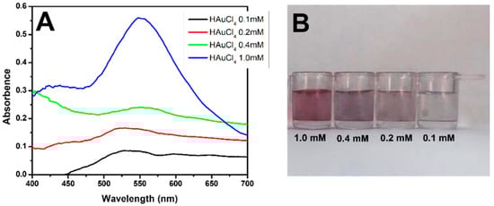 Our detection system is based on the formation of gold nanoparticles. The synthesis of AuNPs using different concentrations of HAuCl4 in MES is shown in Figure 2A. The absorbances and wavelengths of the samples indicated that the nanoparticles were formed only at a concentration of 1 mM, which was also characteristic of the reddish color of AuNPs (Figure 2B).