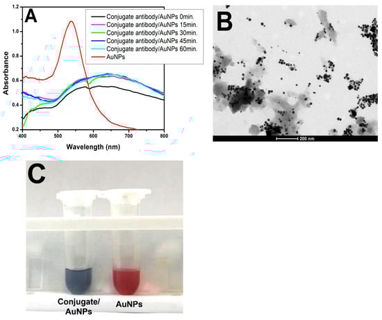 Subsequently, to initiate the pELISA test, the formation of AuNPs was tested in the presence of antibodies (Abs). A conjugate antibody against peroxidase was used (Figure 4A). The spectrophotometer readings at each tested incubation time revealed a gray coloration of the solution, indicating that the nanoparticles were aggregated and irregularly shaped. This occurred because the peroxidase enzyme in the conjugate rapidly consumed the H2O2− added to the microtube. Consequently, when the gold solution was introduced, there was insufficient H2O2− for AuNP formation. TEM images confirmed the irregular formation of nanoparticles (Figure 4B). To validate this observation, a second microtube was prepared containing only H2O2− (100 µM in MES buffer) and gold solution (HAuCl4 in MES). In these microtubes, H2O2− entirely reduced the amount of gold solution, resulting in spherical and dispersed AuNPs characterized by pink coloration (Figure 4C).