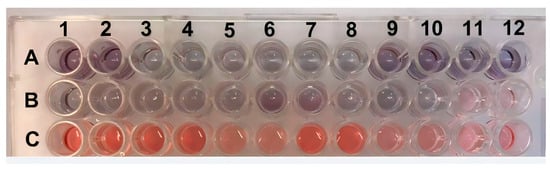 ELISA plate with positive samples in rows (A,B) (viral load ≥ 5 log10 copies/mL) and negative samples (≤4 log10 copies/mL viral load or without the presence of PCV2) in row (C). All samples were tested in duplicate and, they are indicated by the numbers.