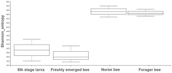 The Shannon entropy diversity index was calculated using statistical analysis to measure the degree of randomness of the microbiome diversity within a sample based on the species diversity and species richness of each sample. The box plot shows the diversity between the nurse bee/forager bee group and the fifth stage larva and freshly emerged bee groups.